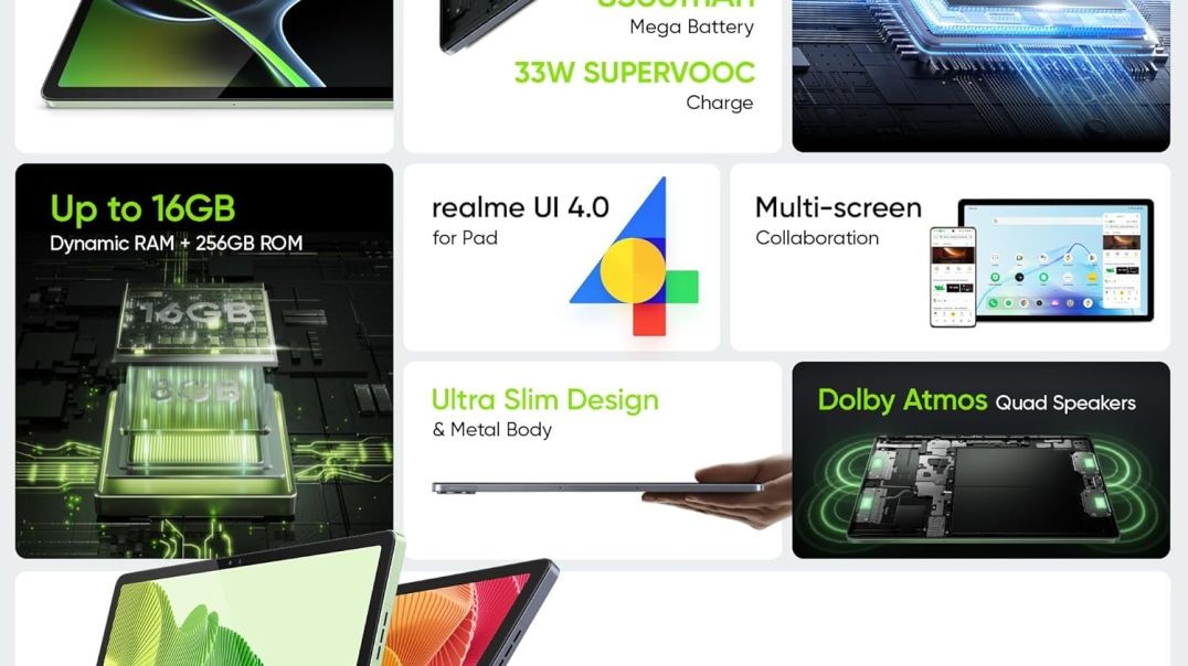 - 【Processor】:- MediaTek Helio G99 Chipset || CPU: 6nm Octa-core, Maximum frequency 2.2GHz, A76×2 2.2GHz, A55×6 2.0GHz || GPU: Arm Mali G57 || realme UI 4.0 for Pad Based on Android 13 | A true powerhouse chipset to get you reliably smooth performance. Boasting a benchmark score of 455,348 two flagship A76 cores up to 2.2GHz, and advanced 6nm process technology, you get smooth power output with low power consumption, for longer-lasting power built with smooth at the core.